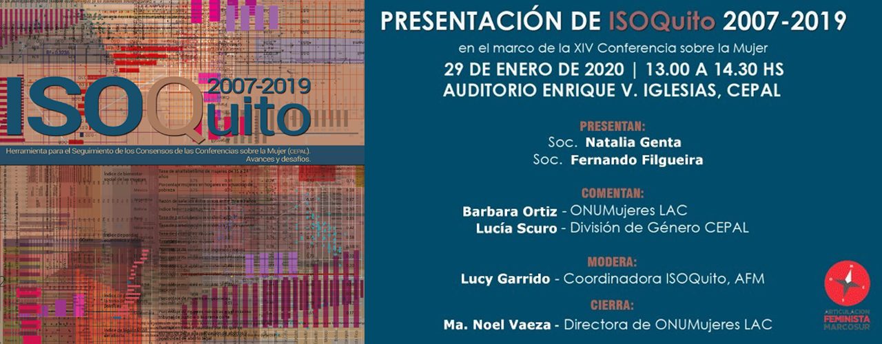 Les invitamos a la presentación de ISOQuito 2007 – 2019. Herramienta para el Seguimiento de los Consensos de las Conferencias sobre la Mujer (CEPAL). Avances y desafíos, que se realizará en el marco de la XIV Conferencia Regional sobre la Mujer de América Latina y el Caribe de la Cepal (más info aquí) 29 de … Sigue leyendo Presentación de ISOQuito 2007-2019 en la XIV Conferencia sobre la Mujer de CEPAL